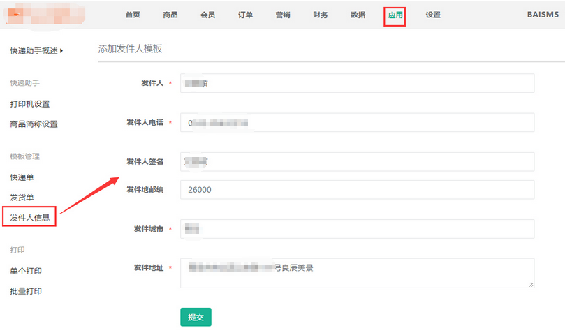 4 添加發(fā)貨人信息,應(yīng)用->快遞助手->發(fā)件人信息